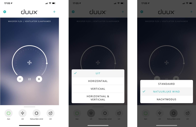 De Duux-app is een modern vormgegeven en duidelijke app waarmee de ventilator snel en eenvoudig te bedienen is. Op het homescherm kun je met vier knoppen de ventilator aan- of uitzetten, de verticale en horizontale draaiing activeren of deactiveren, de modus (standaard, wind en nachtmodus) activeren en een timer instellen (0-12 uur).