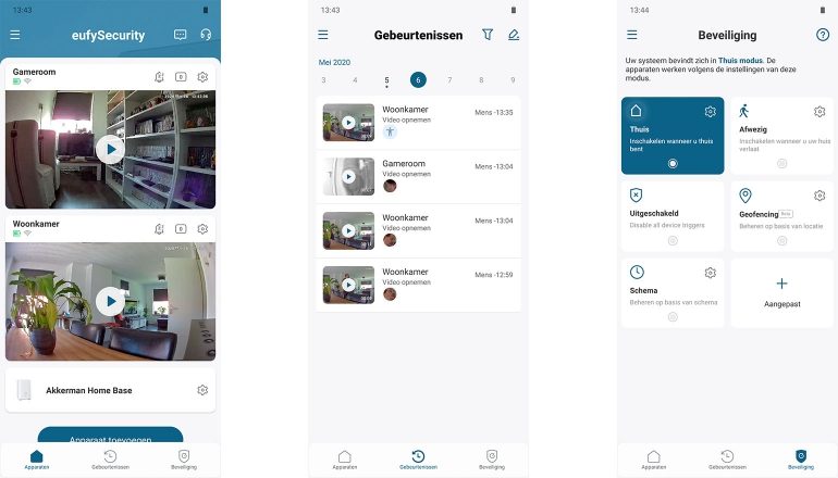 Rechts onderin heb je nog een belangrijke knop op de navigatiebalk. Met het kopje Beveiliging kun je het systeem snel aanpassen. Met de optie Thuis merk Eufycam 2 beweging op, worden video’s opgenomen en krijg je notificaties. Met Afwezig krijg je hetzelfde, maar als er dan beweging gedetecteerd wordt gaat er ook nog eens een alarm af. Met de optie Schema hoef je niet zelf na te denken om het alarm in en uit te schakelen, maar dat is alleen handig als je op vaste momenten weg bent. Je kunt hiervoor ook gebruikmaken van geofencing.