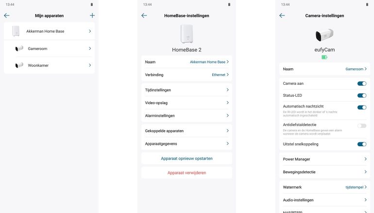 De Eufycam 2 heeft een goede appindeling. Als je een bepaalde instelling zoekt, dan vind je hem zo. Wanneer je de app opent, dan krijg je meteen de camera’s te zien die je toegevoegd hebt aan de HomeBase. Ook staat het basisstation in het overzicht. In alle gevallen kun je dus direct bij de instellingen van de verschillende apparaten, evenals de live feeds van de camera’s. Als je de feed geopend hebt, staan er onderin allerlei functies, zoals alarm, opnemen en praten. Alle functies en mogelijkheden staan wat ons betreft ook op logische plekken.