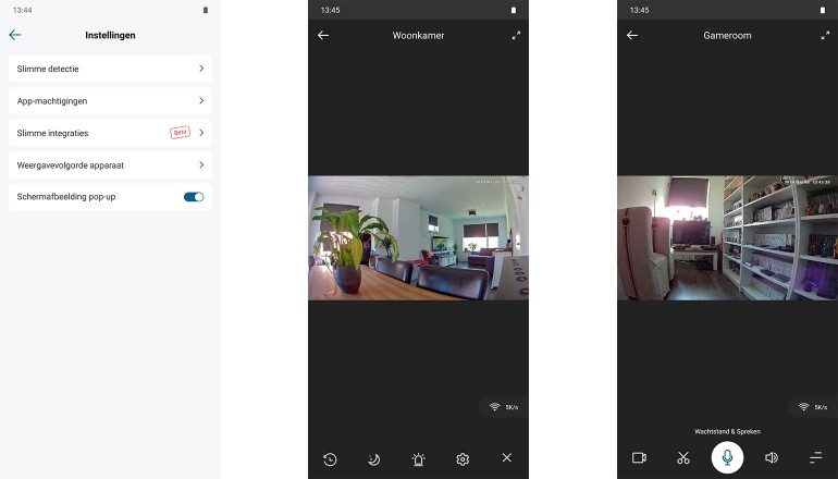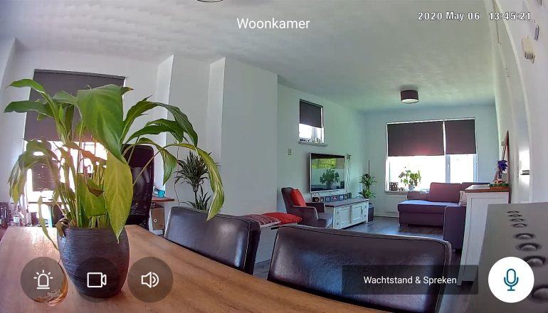 We zijn te spreken over de algemene beeldkwaliteit van de beveiligingscamera’s. Kleuren van meubels komen mooi naar voren, terwijl details in goed verlichte omgevingen goed zichtbaar zijn. Het is goed mogelijk onderscheid te maken tussen alle objecten in huis. Bovendien is de brede kijkhoek ook erg welkom: met een goede hoek leg je een groot deel van de kamer vast. De huiskamer waar de Woonkamercamera in staat (zie screenshots) is 27 vierkante meter groot. Het gros van de kamer kan nu in beeld gebracht worden.