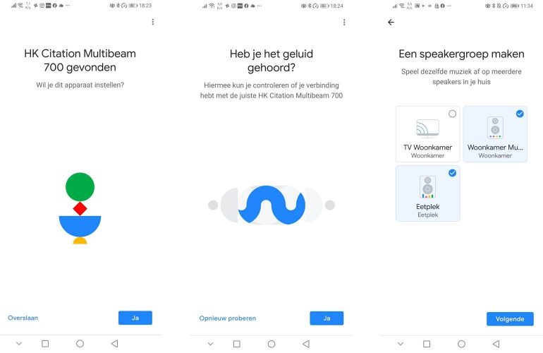 Via Google Home verloopt multiroomgebruik wel wat anders dan bij rivalen als Sonos of Bluesound. Je sleept niet zomaar snel twee of meer speakers op elkaar in een app om ze te koppelen. Neen, je moet in Home een groep aanmaken en daarin de gewenste speakers stoppen. Dat is iets omslachtiger, bijvoorbeeld om het volume van alle speakers goed af te regelen, maar heeft ook zijn voordelen. Je kunt bijvoorbeeld met een spraakbevel heel makkelijk muziek afspelen op die groep. Elke speaker blijft ook altijd apart verschijnen, wat qua bediening makkelijk is.