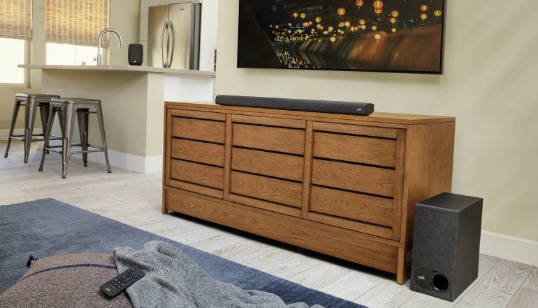Met een tv-meubel ben je nog meer aan fysieke ruimten gebonden. Je bent ofwel genoodzaakt om genoegen te nemen met een kleinere soundbar die op of in je meubel past, óf moet een groter tv-meubel kopen dat ook weer moet passen in de inrichting van de kamer. De hoeveelheid ruimte die de soundbar krijgt is ook belangrijk voor de geluidsproductie. Als een soundbar in een (gedeeltelijk) gesloten kast wordt geplaatst, dan zal het geluid gedempt en blikkerig klinken omdat het gevangen blijft zitten in die kast. Bij duurdere modellen zitten vaak ook drivers die naar de boven- en zijkant wijzen, wat wil zeggen dat die functionaliteit vrijwel helemaal verloren gaat wanneer het apparaat in een kast wordt geplaatst. Je zult in deze gevallen de soundbar altijd bovenop het meubel moeten plaatsen, of een speciale kast kopen die ruimte biedt voor het geluid.