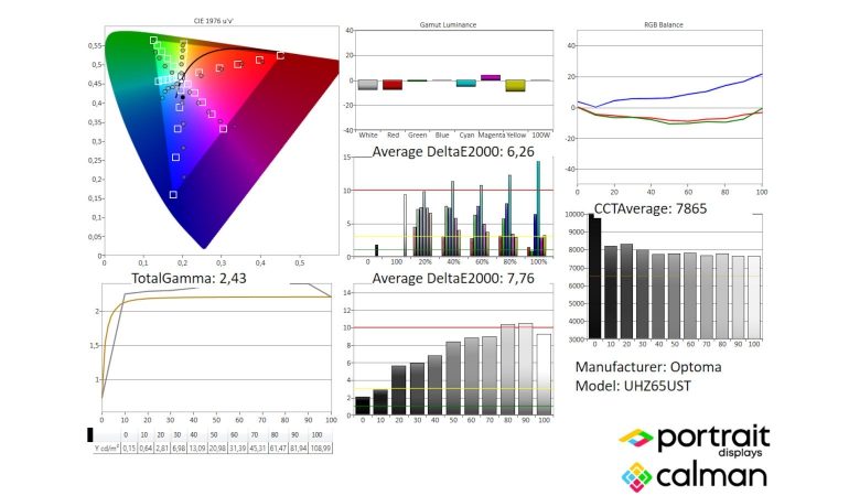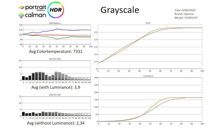 Toch kan de kalibratie van de Referentie mode nog flink wat beter. Zo heeft de grijsschaal een aanzienlijk blauw-overschot waardoor beelden er iets koeler uitzien dan gewenst. Met de gamma-instelling op 2,2 blijkt de projector toch op 2,4 uit te komen, geen drama, het geeft het beeld wat extra plasticiteit. Maar het is toch eerder voor kijken bij verduistering bedoeld. De kleurweergave is redelijk, maar het te intense blauw van de laser is niet voldoende getemperd. Dat trekt uiteraard ook magenta en cyaan extra naar de blauwe kant. Met een goede kalibratie kan je het beeld nog flink verbeteren, maar zelfs zo uit de doos vonden we de beelden erg goed.