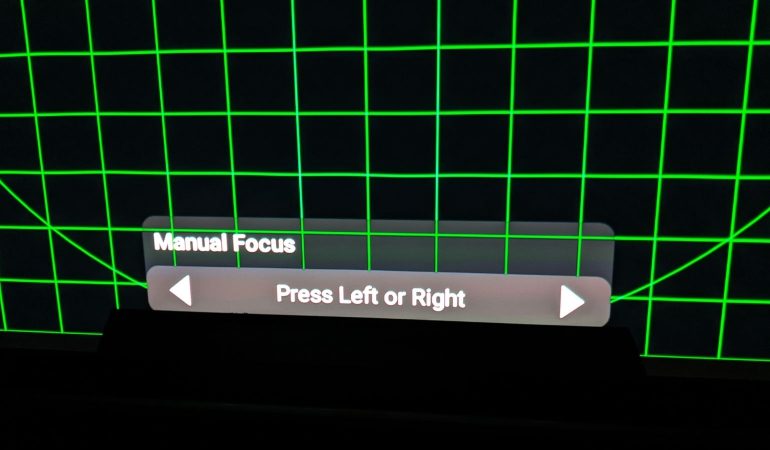 De Optoma UHZ65UST kan een beeld van 80 tot 120 inch projecteren. Zoom en lens-shift ontbreken zoals op de meeste UST-modellen. De focus instellen doe je via de afstandsbediening en is makkelijkst te doen door het ingebouwde testpatroon met een grid op te roepen en vervolgens de focus in te stellen. De linker – en rechterbovenhoek bleven op ons testmodel altijd heel licht uit focus, maar in de praktijk merkten we daar niets van, zelfs niet met een desktopbeeld op het scherm.