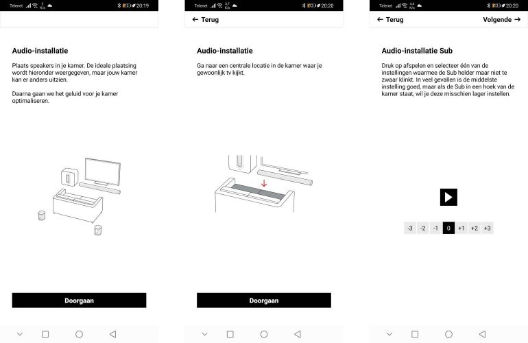 Het stappenplan eindigt met een vraag om het volume van de Sub nog fijn af te regelen. Nog even geduld, want dan moeten de toestellen nog aan elkaar gekoppeld worden. De surroundkanalen communiceren namelijk over een toegewijde 5GHz-verbinding met de Arc.