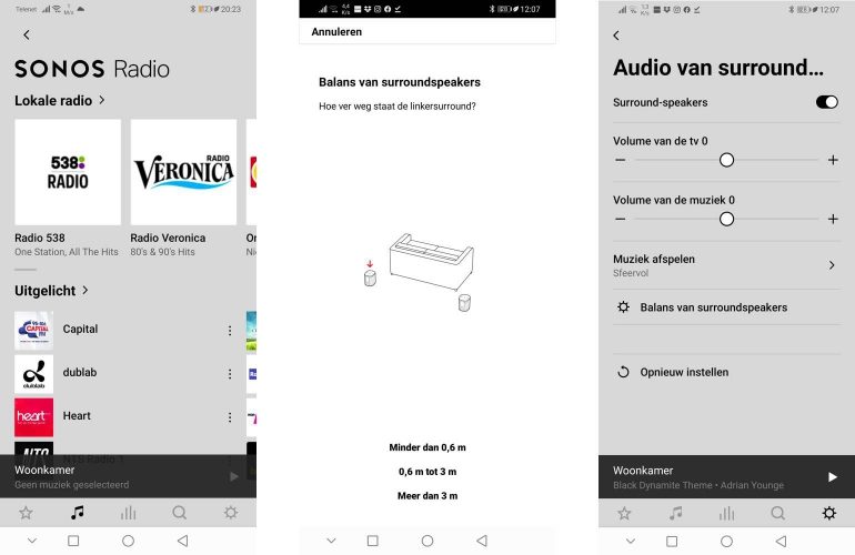 Het instellen van een volledig surroundopstelling met Arc als middelpunt vraagt iets meer dan tijd. Extreem moeilijk is het niet, maar je moet toch wel een aantal extra stappen doorlopen. Een eerste stap is het instellen van de Sub. De heftigheid van bassen wordt sterk beïnvloed door waar je het toestel plaatst, dus dit is wel belangrijk. Als je de Sub in een hoek parkeert, mag het iets minder krachtiger spelen. We hebben ooit een Sonos Sub onder een zetel geschoven; dat werkte zelfs prima, maar het volume moest wel hoger dan normaal. Het was ook niet bepaald vriendelijk voor die glanzende laklaag. Een juist volume zoeken doe je in het stappenplan door een (verrassend hoog) testgeluid af te spelen en dan te kiezen uit tien volumeniveau’s. Er wordt ook gecheckt of de bassen in fase worden afgespeeld – een nogal technisch iets, maar niet moeilijk om in te stellen.