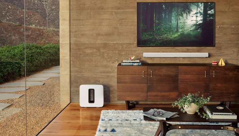 De grote variëteit aan modellen die je kunt gebruiken als surroundspeakers vinden we een enorm pluspunt bij Sonos. Je hebt meerdere keuzes zodat je iets kunt vinden dat bij jouw interieur en situatie past. Zo zijn we heel gecharmeerd door de Ikea Symfonisk-boekenplankspeakers, beschikbaar in zwart of wit. Je kunt ze subtiel ophangen aan de muur én ze zijn niet duur (99 euro). De oudere Play:1-speakers zijn ook interessant omdat ze voorzien zijn van schroefdraad en je ze dus makkelijk kunt ophangen. Nog een optie? Weinig mensen weten dat je een Sonos Amp kunt inzetten voor de rear-kanalen. Dat is een peperdure optie, maar het laat wel toe dat je met inbouwspeakers kunt werken. Dat is nog subtieler. Het is ook goed om weten dat er voor Sonos relatief veel ophang- en staanderoplossingen zijn van derden, zoals Sanus of Flexson.