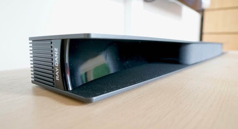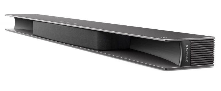 Het ongewone qua design aan de Ray-Danz is dat de voorkant niet over de volledige breedte loopt. In het midden zijn er een verschillende luidsprekers of drivers, maar links en rechts hiervan is de soundbar helemaal open. Je ziet het meteen, omdat het speakergedeelte in een fraai donkergrijs stofje bedekt werd en het open gedeelte bestaat uit een glazend zwarte kunststof. Deze gedeeltes zijn gebogen en lopen in een gewelfde boog naar buiten. Zo ontstaat er links en rechts een akoestische lens die geluidsgolven op een bepaalde manier uitstraalt. Wat je ervaart is dat de speakers in het midden recht naar je wijzen en surroundgeluiden heel breed in de kamer worden gestuurd. Op die manier wordt een bubble gecreëerd waarin jij zit. Het lijkt het best te werken als je op ongeveer 2,5-3,5 meter van de soundbar zit, iets dat ook de fabrikant bevestigd. Die afstand lijkt ons wel conform de situatie in veel woonkamers.