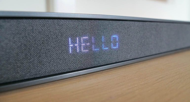 Bij de Ray-Danz ontvang je een kleine remote die functioneel overkomt, maar toch van degelijke kwaliteit lijkt te zijn. Het grote voordeel is dat je via deze afstandsbediening snel verschillende zaken kunt instellen, zoals de surroundmodus, de geluidmodi en de AV-Sync. Als je op een deze knoppen drukt, zie je opeens het bijzonder grote display oplichten die achter het luidsprekerdoek in het midden verstopt zit. Nu ja, die zag je wellicht al eerder, want als je de Ray-Danz inschakelt pinkt hier in het groot ‘HELLO’. En dat betrekkelijk lang, want voor een koude start heeft de soundbar toch wel wat seconden nodig.