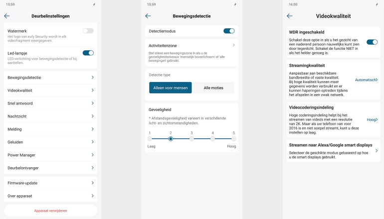De Powermanager is nog interessant apart te vermelden. Zo zijn er twee modi die vooraf ingesteld zijn. Met Optimale batterijlevensduur (een belangrijk punt van de Eufy Security Video Doorbell) is de maximale videolengte twintig seconden. Wordt hetzelfde object nog een keer gezien, dan wordt er géén opname gemaakt. Als je Optimale bewaking kiest dan zijn video’s zestig seconden lang en probeert het systeem elke gebeurtenis vast te leggen. Dit gaat ten koste van de accu. En dan heb je nog de modus waarbij zelf de parameters bepaalt.