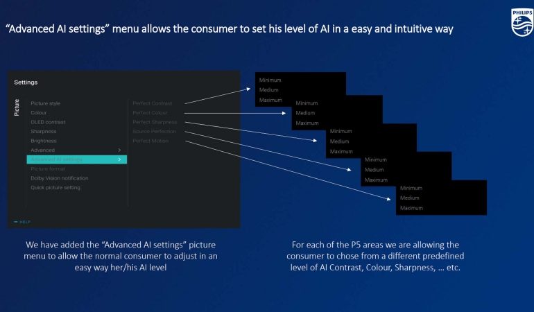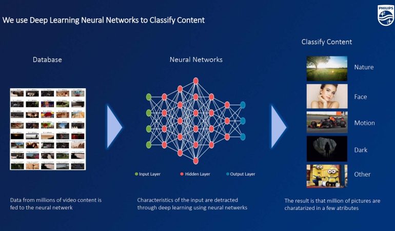 De P5 beeldprocessor van Philips is ondertussen aan zijn vierde generatie toe. De nieuwe generatie voegt een vleugje AI toe aan de beeldverwerking. Concreet maakt de processor gebruik van een door AI getraind algoritme om aan beeldclassificatie te doen. De processor identificeert in welke mate het beeld in deze categorieën valt: Natuur, Gezicht, Beweging, Donker, en Andere. Op basis van die classificatie worden de algoritmes verder op in de beeldverwerking aangepast.