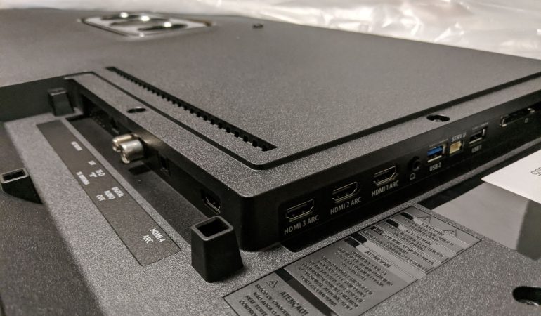 Vier HDMI-aansluitingen is het gebruikelijke aantal voor een high-end tv. Philips blijft evenwel bij HDMI 2.0 aansluitingen, geen HDMI 2.1 versies. Alle vier de aansluitingen bieden ARC en ze zijn klaar voor Ultra HD HDR in de beste kwaliteit. De enige HDMI 2.1-feature die we wel terug vinden is ALLM.