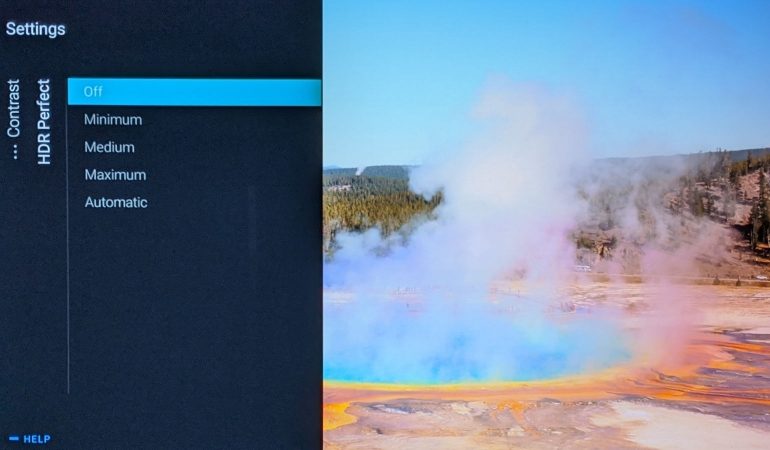 De HDR Film beeldmode is uitstekend gekalibreerd. Philips negeerde in voorgaande modellen alle metadata, maar dat is dit jaar veranderd. Metadata tot 4.000 nits wordt nu wel gerespecteerd, en alle witdetail is zichtbaar tot 4.000 nits, tenminste als je de ‘HDR Perfect’ instelling op Uit of Automatisch zet. De andere standen tillen helderheid licht op, ten koste van witdetail, zoals dat op vorige modellen het geval was.