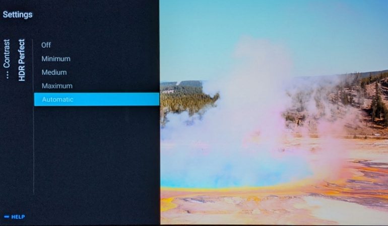 HDR Perfect in de Automatisch stand kan je gebruiken als een vorm van dynamische tonemapping op HDR10-signalen. Op testbeelden zien we dat alle witdetail nog steeds bewaard blijft, maar dat het beeld wel helderder wordt. Ook op echte content zien we dat effect. Het beeld wordt steeds iets helderder, maar daardoor kan het lijken alsof je toch wat aan witdetail verliest. In sommige gevallen worden kleuren ook iets fletser. Onze persoonlijke voorkeur is om HDR Perfect toch in de Uit stand te laten, tenzij je echt de extra helderheid wilt.
