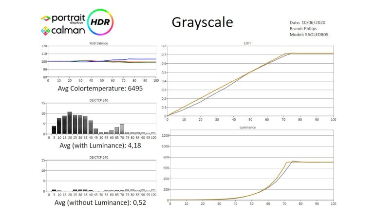De ‘Films’ beeldmode is zo goed als perfect gekalibreerd. De grijsschaal is perfect neutraal, en de kleurweergave quasi perfect. Opvallend is dat de OLED805 ook perfect alle zwartdetail toont. Deze beeldmode gebruikt een gammawaarde van 2,2 die eerder mikt op de doorsnee woonkamer dan op een verduisterde ruimte. Wie voor de echte filmervaring wil gaan, zet de gamma-instelling op +2 voor een gammawaarde van 2,4. Zo wordt het beeld iets donkerder en krijgt het wat meer pop. Het is in elk geval smullen van de knappe beelden.