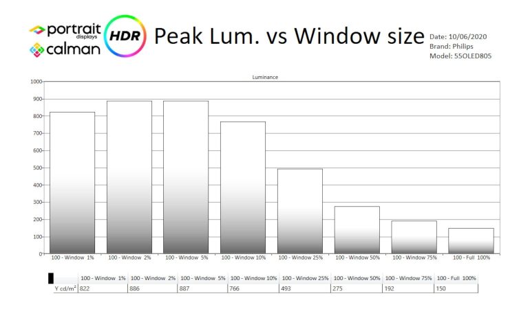 Philips zit traditioneel bij de kop van het peloton voor piekluminantie. In de HDR Film beeldpreset, én met de constrastmode ‘Geoptimaliseerd voor Beeld’ halen we een piekluminantie van ongeveer 805 nits op een 10% venster, en 944 nits op een 2% venster. Beide waardes worden bereikt na enige tijd, in normaal gebruik moet je daar vermoedelijk 50-80 nits af doen. Het blijft een knap resultaat, in lijn met vorig jaar. Een volledig wit scherm klokt af op 148 nits.