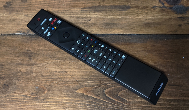 Het toetsenbord dat we op veel Philips remotes vonden is verdwenen. De remote gebruikt Bluetooth voor de spraakopdrachten, maar werkt verder volledig via infrarood.