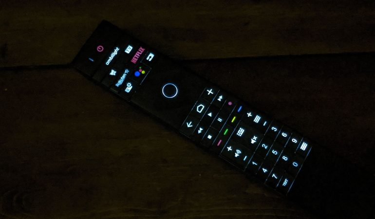 De toetsen zijn verlicht, en de achterzijde is van Muirhead leder, twee details die de remote een tikje luxe geven. De verlichting activeert kort als je een toets indrukt, een ietwat onhandige keuze vermits je dus in het donker de eerste toets moet vinden. Sony pakt dat beter aan met een verlichting die activeert op basis van omgevingslicht en een bewegingssensor.