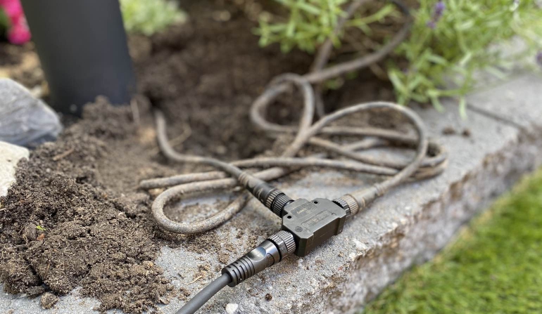 Als eenmaal de juiste positie voor Lily XL gekozen is en de kabels zijn gekoppeld is de rest letterlijk plug-and-play. Het een kwestie van de lamp in het zand steken en de kabels netjes onder het zand wegwerken. Je hoeft ze niet heel diep weg te werken want het is een 12-volt-systeem, maar houd er bij werkzaamheden in de tuin wel rekening mee dat er een kabel ligt. De Lily XL komt overigens met een kabel van 2,5 meter, maar mocht je meer lengte nodig hebben dan kun je ook weer een langere kabel los kopen.