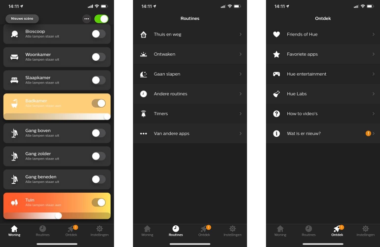 De Tab routines geeft je de mogelijkheid om te automatiseren. Bijvoorbeeld het uitschakelen van alle lampen als je weggaat of het langzaam aanzetten van de lampen in de slaapkamer zodra de zon opkomt. Ook kun je timers instellen en zelf routines aanmaken. De tab Ontdek biedt je extra opties, waaronder formules (experimenten), wat eigen betekent dat het betafuncties zijn die nog niet in de app zelf zitten. Ook kun je Hue koppelen aan andere smarthome-producten (Friends of Hue) en Hue-apps van derden downloaden. Tot slot is er de tab Instellingen. Hier kun je de lampen en kamers configureren, accessoires toevoegen, HomeKit (Siri) instellen, de software updaten en widgets aanmaken.