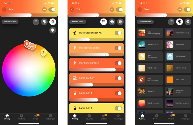 De Philips Hue-app is de afgelopen jaren flink verbeterd en om alle mogelijkheden en functies in elke review van een lamp uit te leggen is wat teveel van het goede. Daarvoor verwijzen we je graag naar onze eerdere Hue-reviews. Kort gezegd is de Hue-app de meest uitgebreide en gebruiksvriendelijke app op het gebied van slimme verlichting. En daarbij kun je in de app ook lampen van andere merken toevoegen, waaronder EcoBright, IKEA en Innr. Het homescherm (de tab Woning) geeft je een overzicht van alle ruimten die je aangemaakt hebt. Hier kun je een ruimte direct aan- of uitzetten. Tik je op de ruimte dan kun je scenes kiezen of aanmaken, individuele lampen in de ruimte aanpassen qua kleur en helderheid of een kleur voor alle lampen kiezen.