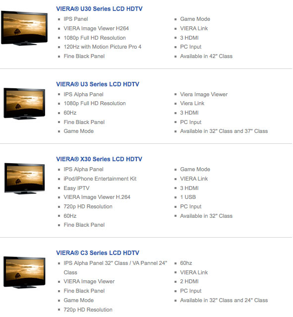 De U3 serie bevat twee modellen, een 37 inch model en een 32 inch model. Beide modellen hebben een 1080p resolutie en maken gebruik van het IPS Alpha Panel. Qua verbindingen zien we drie HDMI aansluitingen, een PC input, Viera Image Viewer en Viera Link.