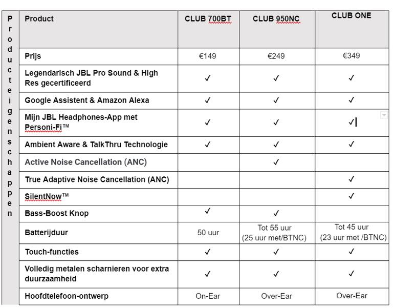 De JBL CLUB-serie is vanaf voorjaar 2020 in het zwart verkrijgbaar. De prijzen vind je in onderstaande afbeelding.