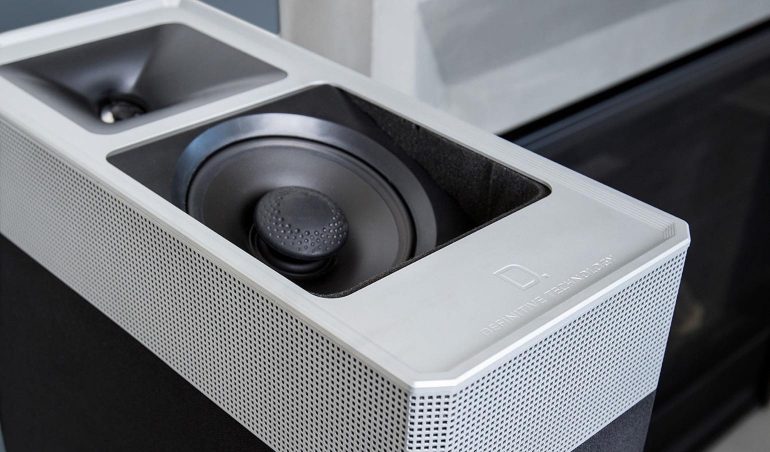 Op de BP9080x breekt de Atmos-speaker de toon nog wat omdat het in een zilveren aluminium is afgewerkt. De Dolby-module bovenaan is bedekt met een stoffen deksel – geen tas koffie op plaatsen, aub – die je kunt verwijderen. Zonder oogt wel stoer, want dan kijk je op de tweeter en midrange-driver (uitgerust met een harde ‘paddestoel’-waveguide die we nog kennen van de recente Definitive Technology Demand-boekenplankspeakers).
