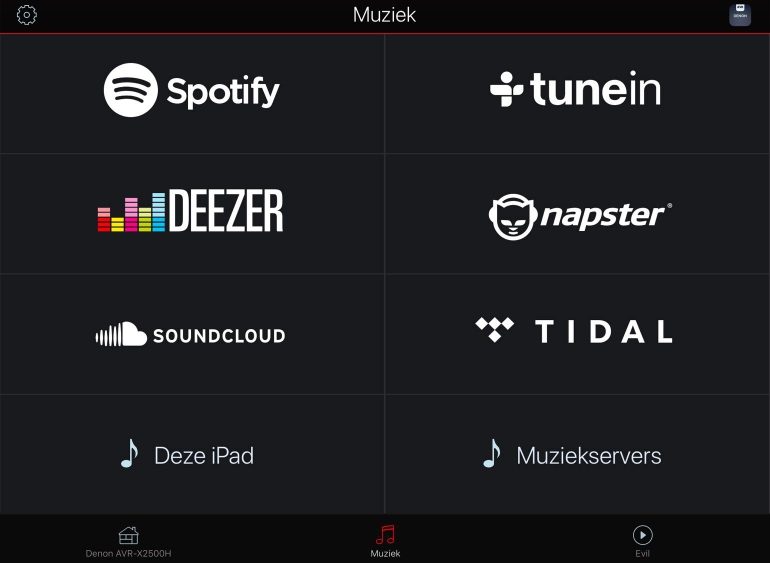 En ja, we schrijven hierboven ‘apps’ want de X2500 heeft er verschillende. Dat heeft helemaal te maken hoe Denon het streamen van muziek aanpakt. Sinds 2016 hebben Denon-receivers HEOS aan boord. Wil je bijvoorbeeld muziekbestanden vanaf een NAS afspelen of nummers vanaf Deezer, dan werk je via de HEOS-app. Via een kleine icoontje in de bovenhoek verspring je snel tussen de HEOS-app en de Denon 2016 AVR Remote-app.