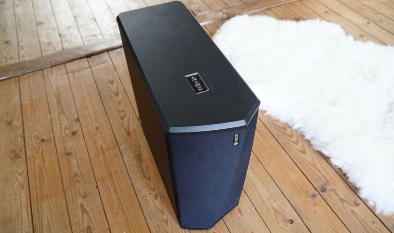 De Subwoofer zelf is een vrij fors en zwaarder ding dat je gerust achteraan in de kamer mag plaatsen. Hij straalt geen te hoge frequenties uit die ons gehoor kan lokaliseren, zoals veel soundbar-subwoofers wél doen. Er is wel een baspoort achteraan, dus plaats hem best niet met deze opening naar de muur (of net wel, als je wat extra stevige bassen wil).
