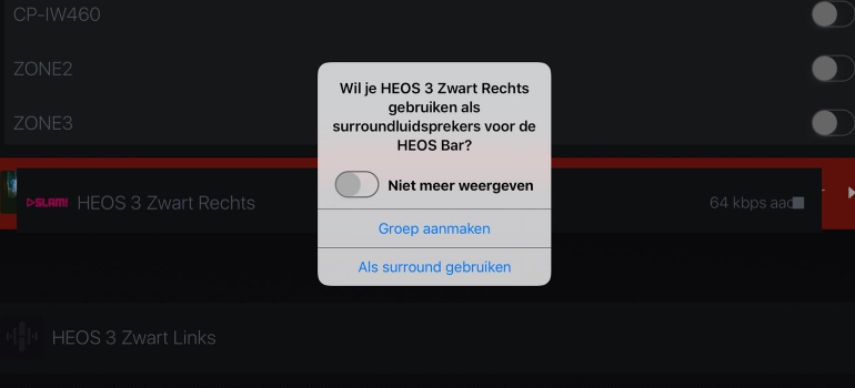Een pluspunt aan HEOS is dat het koppelen van speakers aan de HEOS Bar zo snel gaat dat je het ook ad hoc kunt doen. Het is heel haalbaar om bijvoorbeeld twee HEOS 1-speakers gedurende de dag in de keuken te gebruiken en ze dan ’s avonds voor een filmavond naar de woonkamer te brengen. Die flexibiliteit mis je onder meer bij Sonos, waar het (ont)koppelen van een Sub en Sonos-speakers met de Playbar meer werk en tijd vergt. Concreet verloopt het koppelen van speakers aan de HEOS Bar op dezelfde manier als het groeperen van HEOS-producten: in de app sleep je de speaker naar de HEOS Bar, waarna je de vraag krijgt of je een surroundopstelling wil creëren of gewoon een groep. In dat laatste geval spelen de speakers hetzelfde als de soundbar.