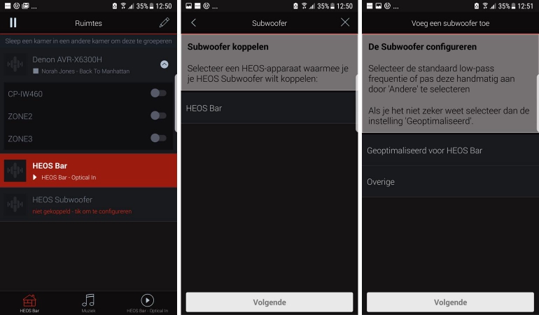 De Subwoofer aan de HEOS Bar koppelen gaat even vlot. Hij verschijnt gewoon in het overzicht van apparaten onder ‘Ruimtes’. Tik er op en je krijgt een lijst van HEOS-apparaten waaraan je de subwoofer kunt linken. Zoals gezegd laat de HEOS-app toe om een low pass-filter in te stellen, maar voor bepaalde HEOS-apparaten (zoals de Bar) kun je gewoon voor een optimaliseerde setting gaan. Heb je al surroundspeakers toegevoegd, dan krijg je ook de vraag of de subwoofer de productie van hun lage frequenties moet overnemen (het alternatief is ‘Full Range’). Het voordeel daaraan is dat zowel de Bar als de twee rear-speakers dan geen bassen proberen te produceren, waardoor hun drivers optimaler het middengebied kunnen weergeven. Tenzij je echt een grote kamer hebt, zeker deze optie inschakelen.