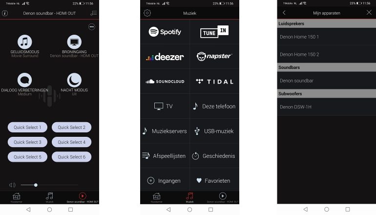 Muziekdiensten zijn volledig geïntegreerd voor alle drie de Home-speakers. Denk aan Spotify, Napster, Tidal, TuneIn, Deezer, AirPlay 2 en ook wifi en Bluetooth worden ondersteund. Ook bestanden in hoge resolutie zoals 192kHz/24-bit, FLAC-, WAV-, ALAC en DSD 2.8/5.6MHz worden ondersteund. En uiteraard zorgt HEOS Built-in ervoor dat je de Denon Home-speakers niet alleen met elkaar, maar ook met soundbars, netwerkspelers en AV-receivers kunt koppelen voor een multiroom-ervaring. Hiervoor sleep je de aangesloten apparaten simpelweg over elkaar heen in de HEOS-app, zodat muziek synchroon afgespeeld wordt. Je hoeft overigens de HEOS-app niet te gebruiken. Heb je Spotify, dan kun je direct kiezen voor Spotify Connect en de Denon-speakers gebruiken. Ook kun je Apple Music gebruiken via Airplay 2.