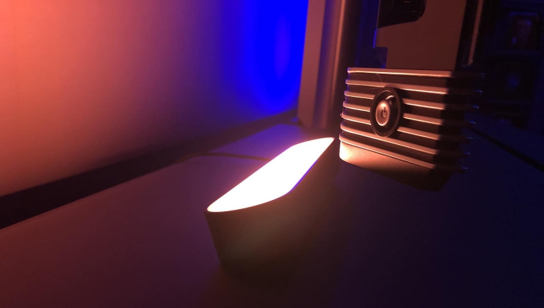 De Hue Play is veel minder design en juist meer functie en sfeer. Deze lampen zijn ook ontwikkeld om een muur te verlichten maar zijn een stuk flexibeler in te zetten, en te verbergen. De Hue Play’s zijn compacte led-lampen in een zwarte behuizing die je op verschillende manieren in kunt zetten om diffuus licht op de muur te projecteren. Alle manieren zijn eigenlijk bedoeld voor bij een televisie of computermonitor, om een Ambilight-achtig effect weer te geven of juist samen te werken met Ambilight (mits je een Philips tv hebt). Er zijn vier standaard manieren om de lampen te gebruiken. Ten eerste kun je de lampen dankzij hun schuine achterzijde in een kleine hoek op een tafel, meubel of bureau zetten en ze zo licht op de muur laten schijnen. In ons geval bleek deze meest simpele oplossing ook meteen een mooie oplossing. Middels de meegeleverde voetjes kun je echter nog een stap verder gaan. Je kunt de lampen hiermee verticaal op een voet naast een tv of monitor zetten of je kunt ze achterop een televisie plakken (plakstrips worden meegeleverd). Binnen deze laatste optie kun je ze met de platte voetjes direct richting de muur wijzen, of met de staande voetjes naar de zijkant laten wijzen. Kortom, je kunt er alle kanten mee op om jouw thuisbioscoop, tv-opstelling, game-opstelling of computer van extra sfeer te voorzien. Net als de Signe zijn de Play-lampen strak vormgegeven en voelen ze hoogwaardig aan. Je kunt de Play overigens het beste in een paar (of meer) kopen om zo een optimaal effect te creëren. Wanneer je een paar koopt heb je op de adapter nog ruimte voor het aansluiten van een extra Play-lamp.