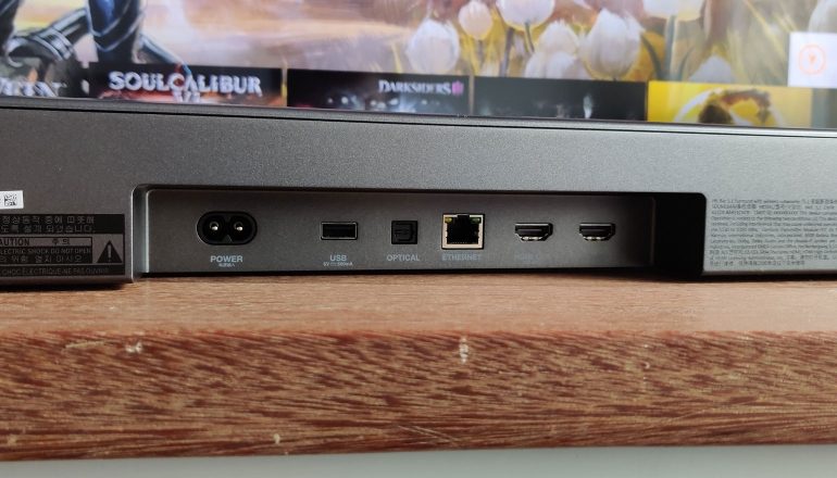 Achterop treffen we verschillende aansluitingen aan. Zo is er eentje voor de stekker. Dit is een standaardaansluiting, aangezien de stekkerblok in de Bar 5.1 Surround verwerkt zit. Daarnaast treffen we een optische aansluitingen en twee hdmi-poorten. Eentje is hdmi-arc, waardoor je de soundbar dus ook kunt bedienen met de remote van je televisie. De andere is hdmi-in, zodat je er een spelcomputer of blu-ray-speler op kunt aansluiten. De usb-poort kan in Nederland niet gebruikt worden voor het afspelen van muziek.