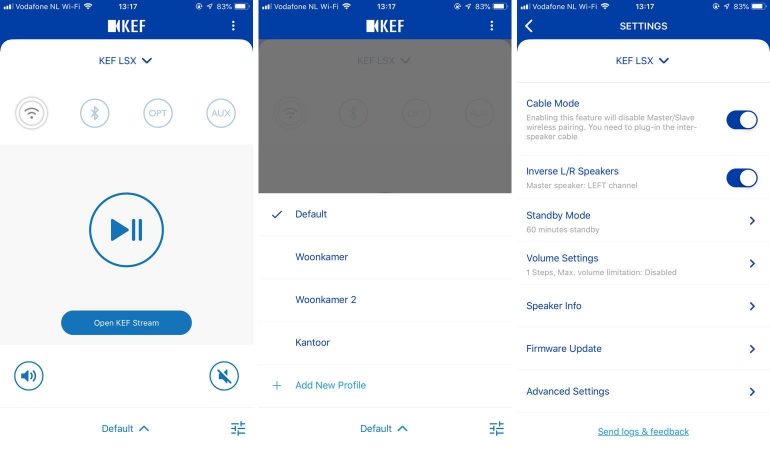 De app waar je mee start is dus de KEF Control-app. Hier kun je de basis goedzetten en de basisfuncties van de LSX bedienen. Aan- en uitzetten, het volume wijzigen, de speakers muten, de bron kiezen en er bijvoorbeeld voor kiezen de kabel tussen de master en slave te verwijderen en ze puur draadloos te laten communiceren. Dit laatste zorgt er overigens wel voor dat de maximale kwaliteit van het audiosignaal iets achteruit gaat. Het systeem kan hi-res bestanden van maximaal 24-bit/192kHz afspelen, maar downsampled alles naar 24-bit/48kHz als de speakers draadloos gekoppeld zijn, of 24-bit/96kHz als je de ethernetkabel ertussen gebruikt.