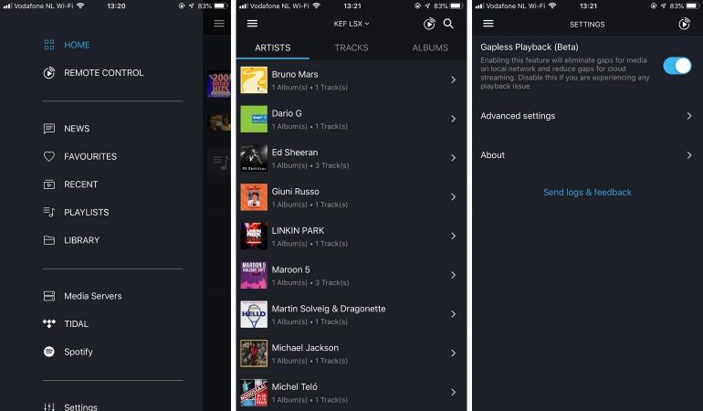 Er is echter nog een tweede app; de KEF Stream-app. Hiermee kun je de muziekbronnen uit het netwerk of streamingdiensten selecteren en bedienen. Je gebruikt deze app met name wanneer je muziek van Tidal of een eigen DLNA-server afspeelt. Gebruik je Spotify dan kom je toch snel in de Spotify-app terecht en kies je hier de LSX om de muziek op af te spelen. Gebruik je Apple Music dan is de kans groot dat je gewoon Apple’s AirPlay gebruikt om direct naar de LSX te streamen. Het is een toegangspoort tot content maar dus met name voor diegenen die muziek vanaf een eigen server willen weergeven. De app is strak vormgegeven, werkt soepel en biedt een goed overzicht van al je media.