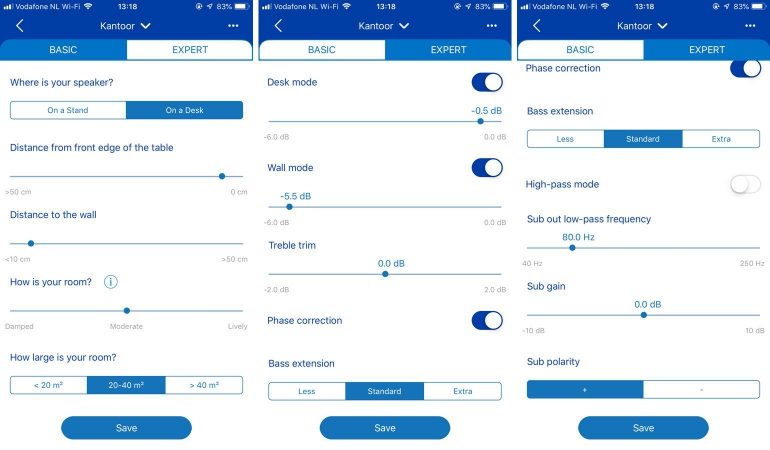Wat betreft de equalizer kun je kiezen voor de standaard ‘default’ instelling, maar zoals gezegd raden we aan zelf met de settings aan de slag te gaan. Je maakt simpelweg een nieuw profiel aan en geeft in dit profiel aan hoe de speakers geplaatst zijn. Op een standaard of op een bureau/tafel, de afstand tot de muur, de levendigheid van de ruimte, de grootte van de ruimte en of er een subwoofer aangesloten is. Dit is in de basis voor de beginnende gebruiker voldoende om de audioweergave aan te passen aan de plaatsing en de ruimte. Wil je toch verder in de instellingen duiken dan ga je naar de tab ‘Expert’. Hier kun je de ‘desk mode’ ‘wall mode’ individueel aanpassen, treble aanpassen, de fase corrigeren, de lage tonen benadrukken of minder benadrukken en instellingen voor een aangesloten subwoofer aanpassen.