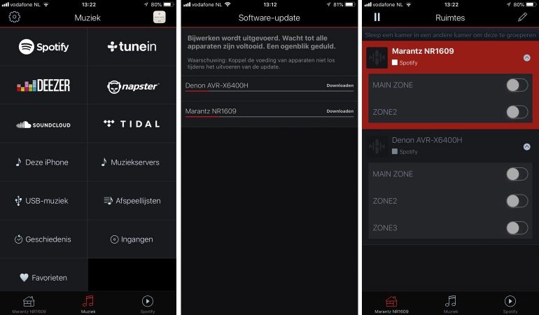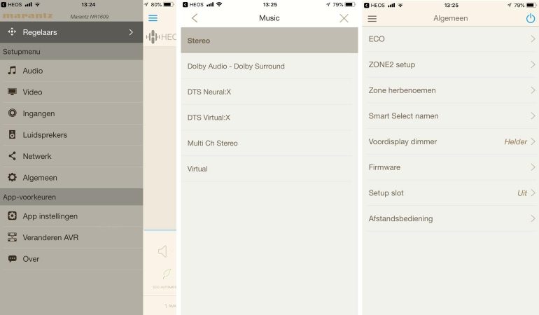 De HEOS-app heeft al jaren dezelfde interface en oogt niet enorm spannend, maar zit functioneel goed in elkaar. De app werkt met drie grote schermen, te selecteren via de tabs onderaan. De eerste toont de lijst met verbonden HEOS-apparaten, het middelste alle muziekbronnen (incluis alle fysieke ingangen op de receiver), het derde wat er momenteel speelt. Zeer praktisch is dat je in de HEOS-app dus kunt overschakelen van een streamingbron naar bijvoorbeeld je aangesloten cd-speler en dat je geluidsmodi (zoals ‘stereo’ of ‘surround stereo’) kunt selecteren. Je hoeft dus niet terug te keren naar de Remote-app of de afstandsbediening.
