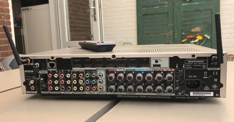 Op het gebied van aansluitingen zien we zowel aan de voorzijde als de achterzijde elementen terug. De achterzijde is onder meer voorzien van 7 speakerterminals, zeven HDMI-ingangen, één HDMI-uitgang, twee subwoofer-uitgangen, een coaxiale en optische audio-input en diverse analoge inputs. Ook is er een ethernetpoort aanwezig. Op de voorzijde zien we nog een extra HDMI-ingang, een usb-poort en een Phono-ingang terug.