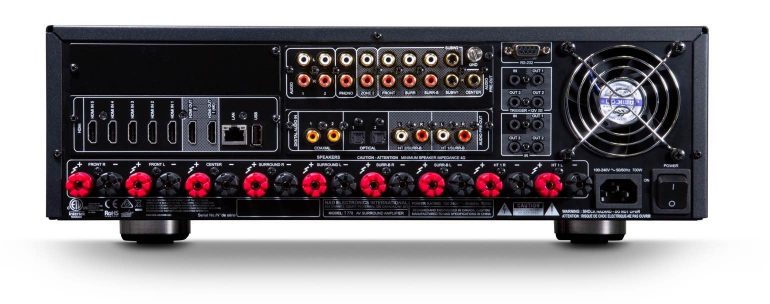 Met een prijskaartje van net geen 3.000 euro is deze 9.1-receiver met Hybrid Digital-versterking misschien niet voor de doorsnee consument weggelegd. Het mikt hoger. De T 778 moet zowel de liefhebber aanspreken die zelf een thuisbioscoop bouwt als professionals die een veelzijdig apparaat zoeken om een surroundopstelling aan te drijven. Daarvoor zijn ook de nodige zaken voorzien, zoals smarthome-integratie, een RS232-poort en veel extra programmeerbare triggers. Deze NAD is een 9.1-receiver die geschikt is voor een varia van opstellingen. 5.1.2 bijvoorbeeld, wat mogelijk is dankzij ondersteuning voor DTS:X en Dolby Atmos. Gebruik je hem (volledig of deels) als processor via de voorziene pre-outs, dan kun je gaan naar 7.2.4. Met 6 HDMI-ingangen en twee HDMI-uitgangen is de T 778 goed voorzien qua videoconnectiviteit, en ook op vlak van audio-ingangen is er voldoende voorzien. Er is ook een input voor een draaitafel.
