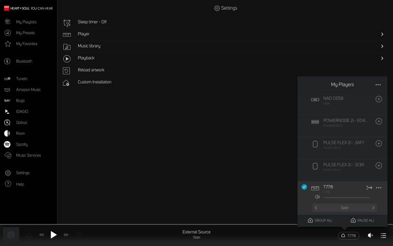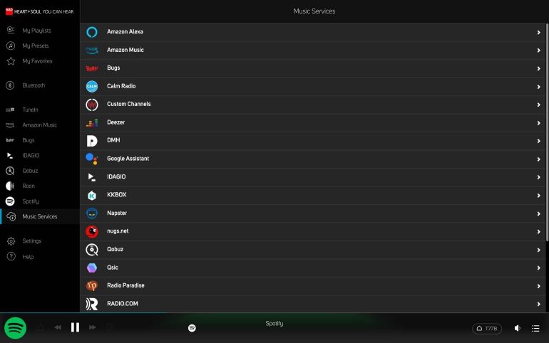 Receivers hebben zelden een tekort aan streamingopties. Ook de T 778 geeft je meerdere mogelijkheden. Maar eentje zoals als BluOS kom je niet vaak tegen, want dit platform het biedt veel meer mogelijkheden dan normaal. Dit platform vormt niet enkel de basis van de Bluesound-apparaten, maar draait tevens op Dali-speakers, NAD-toestellen en CI-producten van Monitor Audio. Al die toestellen kun je in je woning combineren en bedienen vanuit de BluOS-app, een sterke troef voor wie zijn hele huis wil automatiseren (en installateurs). De app is gebruiksvriendelijk – vooral op een tabletscherm – en biedt ondersteuning voor je hi-resaudiobestanden en heel wat muziekdiensten. Alle grote en heel wat kleine diensten zijn aanwezig, BluOS scoort hier echt mee. De enigen van belang die in de app missen zijn Apple Music en YouTube Music. Beide kun je via Airplay 2 of Bluetooth (enkel SBC) streamen als je dat wenst; YouTube Music kan eveneens via de Google Assistant. De T 778 kun je immers qua streaming met de stem bedienen, mits je een apparaat met een microfoon (zoals een Home mini) voorziet.