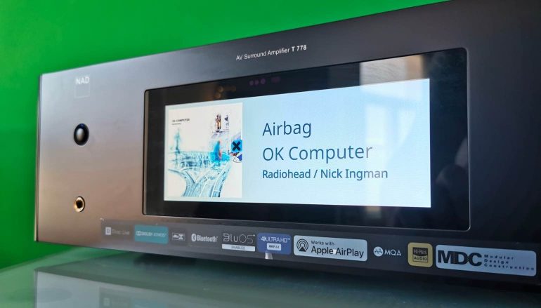 Bij dit toestel draait het vooral rond het nieuwe hardwareplatform. Wat er onder de motorkap steekt. Maar die motorkap zelf verdient in dit geval ook wat aandacht. De T 778 ziet er heel goed uit. En dat verrast ergens wel, want tenzij je koos voor een toestel uit de luxueuze Master-reeks kreeg je bij NAD vroeger altijd iets dat qua looks eerder functioneel te noemen was. De laatste tijd komt daar wel wat verandering in, en hoe. De T 778 is geen onderdeel van de Master-familie zoals de M10 dat wel is, maar pakt toch uit met een zeer verzorgd gelaat. En wat een contrast met de meeste AV-receivers op de markt! De NAD-receiver etaleert niet meer knopjes dan het dashboard van een Boeing 747, zoals sommige rivalen, maar straalt een ultieme soberheid uit. Eén draaiknop, één aan/uit-schakelaar. Een paar aansluitingen. Dat is het. Hoe is dat mogelijk? Heel simpel. De ontwerpers namen het grote aanraakscherm van de M10 en plaatste het centraal in het voorpaneel. Dat levert een driedubbele winst op: ten eerste wordt de voorkant minder druk, ten tweede laat een touchscreen toe om een complexe bediening te vergezellen van meer informatie, en ten slotte krijg je enkel de instellingen te zien die je op dat moment nodig hebt. Dat je bij het streamen van media op de display de albumhoes en informatie over de track te zien krijgt is de kers op de taart. Wil je nog een kers? Je kunt op de display ook digitale VU-meters tonen die (mogelijk) meebewegen op de muziek.