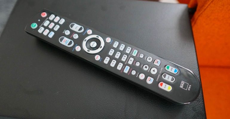 De meegeleverde grote afstandsbediening is typisch NAD. Handig is dat je het kunt gebruiken om andere IR-codes aan te leren, zodat je andere apparaten bedient vanaf hetzelfde kastje. Ook praktisch is dat je via drie toetsen onderaan direct het volumeniveau van de center, sub en surroundkanalen kunt bijregelen. Maar we vinden het wel onlogisch dat bij het navigeren door de instellingen op enter drukken niet werkt als ‘bevestigen’ maar je naar de volgende optie in de rij brengt (net zoals een pijl naar beneden). Dat is een conventie die zo diep ingebakken zit bij ons dat we ons constant vergisten. Een schouderklopje voor NAD dat ze ook een tweede eenvoudige remote meeleveren. Dat is veel handiger en minder afschrikkend voor de rest van het gezin (en verkleint de kans van ‘oeps, ik heb op iets gedrukt’-problemen).