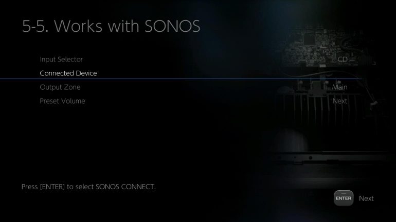 Onkyo heeft zijn eigen draadloze speakers, maar dat weerhoudt het merk niet om een alliantie te sluiten met Sonos. Dit heeft geleid tot de Works with Sonos-functie, waarmee je relatief eenvoudig de Onkyo TX-NR696 kunt integreren in een Sonos-systeem. Nu ja, het is een halvelingse integratie. De Sonos-software zit niet echt in de receiver ingebakken, enkel een paar instellingen die het koppelen met een Sonos Connect-streamer eenvoudig maken.