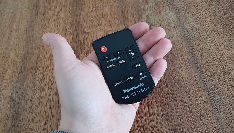 Aan de zijkanten zit enkele knoppen waarmee je basale functies op de soundbar kunt bedienen. Dat is altijd mooi meegenomen, omdat er situaties zijn waar je dichterbij de soundbar staat dan de afstandsbediening. Ook zitten er een paar lampjes bovenop de bar, die aangeven welke geluidsmodus je nu hebt ingeschakeld. Ook kun je hier zien welke bron je hebt geselecteerd. Verder levert Panasonic een kleine afstandsbediening mee die toegang geeft tot alle functies; met je eigen afstandsbediening kun je de basisfuncties bedienen.