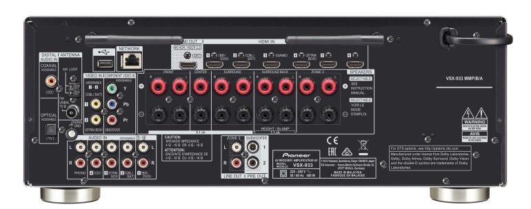 De VSX-933 is goed voorzien van HDMI-ingangen. Je hebt er zes, waarvan vier kunnen toegewezen worden aan vaste labels (zoals Game of BD/DVD). Eigen etiketten ingeven kan niet. Er is één HDMI-uitgang. Alles is HDCP 2.2-compatibel en kan 4K HDR-content doorgeven (HDR10, HLG en Dolby Vision). Twee digitale ingangen (eenmaal optisch, eenmaal coaxiaal) en vijf analoge ingangen (waarvan één phono) zijn voorzien voor audiobronnen zoals cd-spelers en draaitafels. Video-aansluitingen uit het verre tv-verleden en een USB-ingang voor een opslag met muziekbestanden maken het plaatje compleet. Vooraan komt daar nog een USB-ingang en een aux-aansluiting voor een muziekspeler bij. Het zijn veel aansluitingen, volgens de norm in het segment.