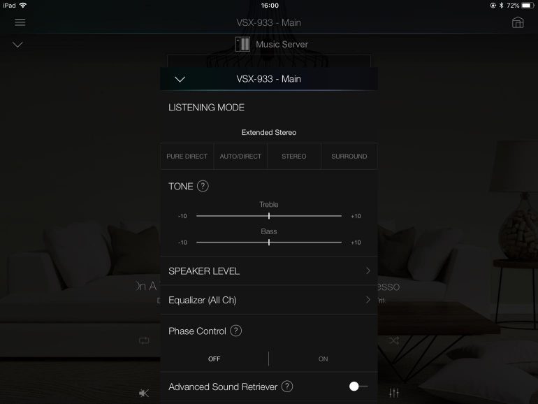 Los daarvan is de Pioneer Remote-app goed ingericht, waardoor je snel vindt wat je zoekt. We vinden het altijd fijn als je vanuit één helder opgebouwd scherm snel kunt schakelen tussen fysieke bronnen (zoals een aangesloten Blu-ray-speler) en streamingdiensten (Deezer, Tidal en TuneIn zijn ingebouwd), en dat is hier het geval. Praktisch is dat je vanuit het scherm met de huidige track met één keer tikken bij heel wat geluidsinstellingen kunt komen. Moeiteloos verander je hoe het geluid wordt verwerkt, maar ook zaken als individuele volumeniveaus van speakers en treble/bas. Voor het fijn afregelen van de klank is dat wel handig.