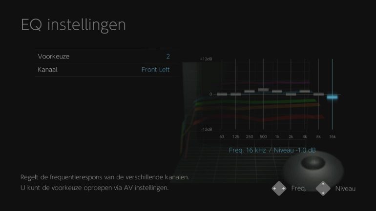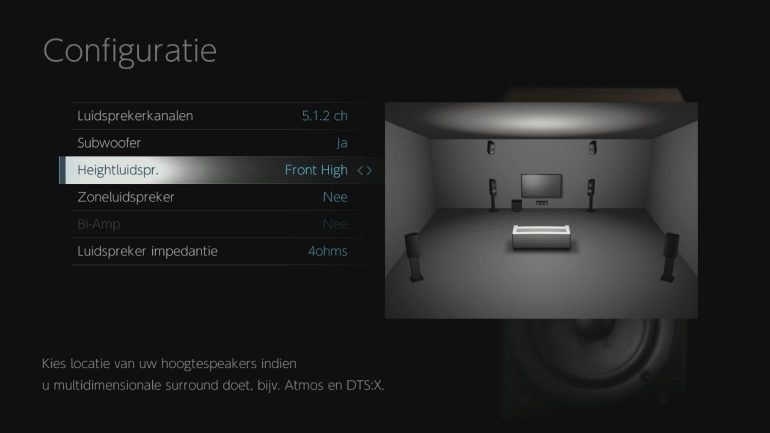Via de tv-interface geef je aan welke speakeropstelling je gaat plaatsen. Positief is dat Pioneer je veel mogelijkheden geeft qua de type en positie van hoogtekanalen. Kies je voor zogenaamde Dolby-speakers (reflecterende luidsprekers die boven op je gewone speakers staan), dan kun je de hoogte tot aan het plafond ingeven. Dat is een belangrijke instelling, maar soms ontbreekt het. Pioneer voegt hier ook de Reflex Optimizer aan toe, een functie die probeert faseproblemen (waarbij geluid van de speakers op oorhoogte eerder arriveert dan de geluidsgolven van de reflecterende luidsprekers) op te lossen. Zeker proberen, het levert subtiel een verbetering op, zeker in een grotere ruimte.