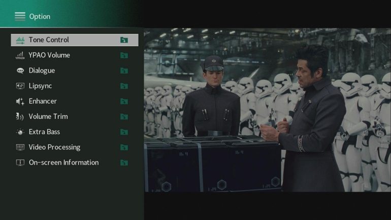 Vergeleken met de Yamaha RX-V685 die we enkele weken geleden bekeken presenteert de Pioneer VSX-933 een veel eenvoudigere tv-interface. Het hoofdmenu biedt je maar drie opties: systeeminstellingen, een menu voor het Multi-Channel Acoustic Calibration System en een menu voor Bluetooth/netwerkinstellingen. De interface is nog in 720p, maar waardeert door zijn fijn lijn- en lettergebruik relatief mooi op naar 4K. Ja, ja, we gaan opnieuw zeggen, net zoals bij de recente reviews van rivaliserende receivers: tijd om die gloednieuwe 4K-compatibele receivers ook effectief een Ultra HD-interface mee te geven. Zeker op een 4K-projector is dat broodnodig.